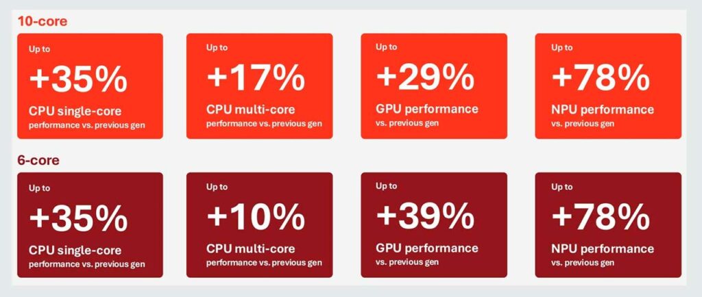 | Mejora de rendimiento CPU | Hasta +35% en mononúcleo frente a Snapdragon X Plus anterior |