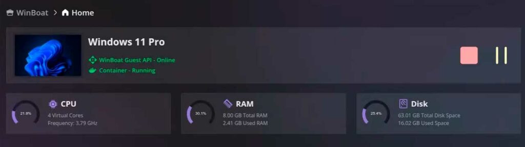 Además, el proyecto soporta smartcard passthrough, algo clave para entornos profesionales donde se usen tarjetas criptográficas, lectores de DNIe o sistemas de firma electrónica ligados a software de Windows. Todo ello se gestiona desde la interfaz de WinBoat, y se complementa con un pequeño módulo de monitorización de recursos para que veas cuánta RAM y CPU está consumiendo la instancia de Windows.